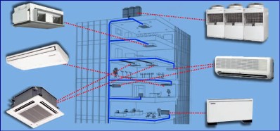 Impianti con canalizzazioni d’aria a soffitto o a fan coil alimentati da centrale frigorifera o unità esterna adatti per ambienti commerciali o industriali.